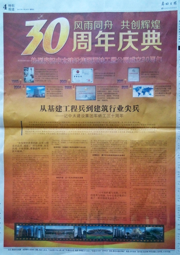 中太建設(shè)集團(tuán)是發(fā)源于20世紀(jì)60年代,前身為中國人民解放軍基建工程兵352團(tuán),曾被軍兵種授予“第一流施工隊(duì)伍”、“全軍管理教育先進(jìn)單位”榮譽(yù)稱號和獲得國家機(jī)關(guān)命名“全國先進(jìn)施工企業(yè)”金質(zhì)獎(jiǎng)?wù)隆?985年,全團(tuán)1933名官兵積極響應(yīng)國務(wù)院和中央軍委的號召,毅然脫下軍裝,告別軍旅生活,由部隊(duì)集體轉(zhuǎn)業(yè)到了廊坊,成為了地方國有企業(yè)員工。軍轉(zhuǎn)工30年來,他們經(jīng)歷了從部隊(duì)到國企、由國有企業(yè)到股份制集團(tuán)的思想轉(zhuǎn)變與改革創(chuàng)新,由二級資質(zhì)企業(yè)到一級資質(zhì)企業(yè),再到特級資質(zhì)企業(yè)的發(fā)展歷程;30年來,勤勞奮發(fā)的中太人繼承和弘揚(yáng)了人民軍隊(duì)的光榮傳統(tǒng)和優(yōu)良作風(fēng),在創(chuàng)新發(fā)展的征程中團(tuán)結(jié)拼搏、攻堅(jiān)克難、勇攀高峰,奪取了一個(gè)又一個(gè)的勝利,創(chuàng)立了一個(gè)又一個(gè)的輝煌,實(shí)現(xiàn)由基建工程兵向建筑業(yè)尖兵的華麗轉(zhuǎn)身,打造了一張中國建筑業(yè)名片。