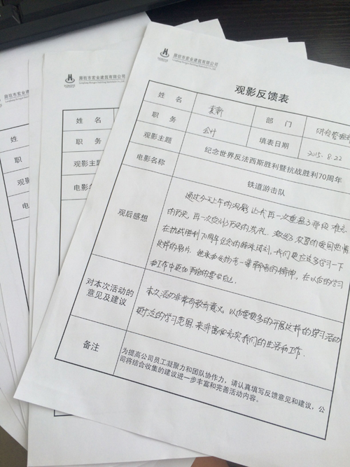 2015年8月22日,為紀(jì)念反法西斯戰(zhàn)爭勝利70周年,宏業(yè)公司組織全體員工進(jìn)行了一次革命傳統(tǒng)教育活動(dòng),觀看了電影《鐵道游擊隊(duì)》,一同回顧了那段血淚鑄成的抗戰(zhàn)史,共同緬懷先烈們的英靈。