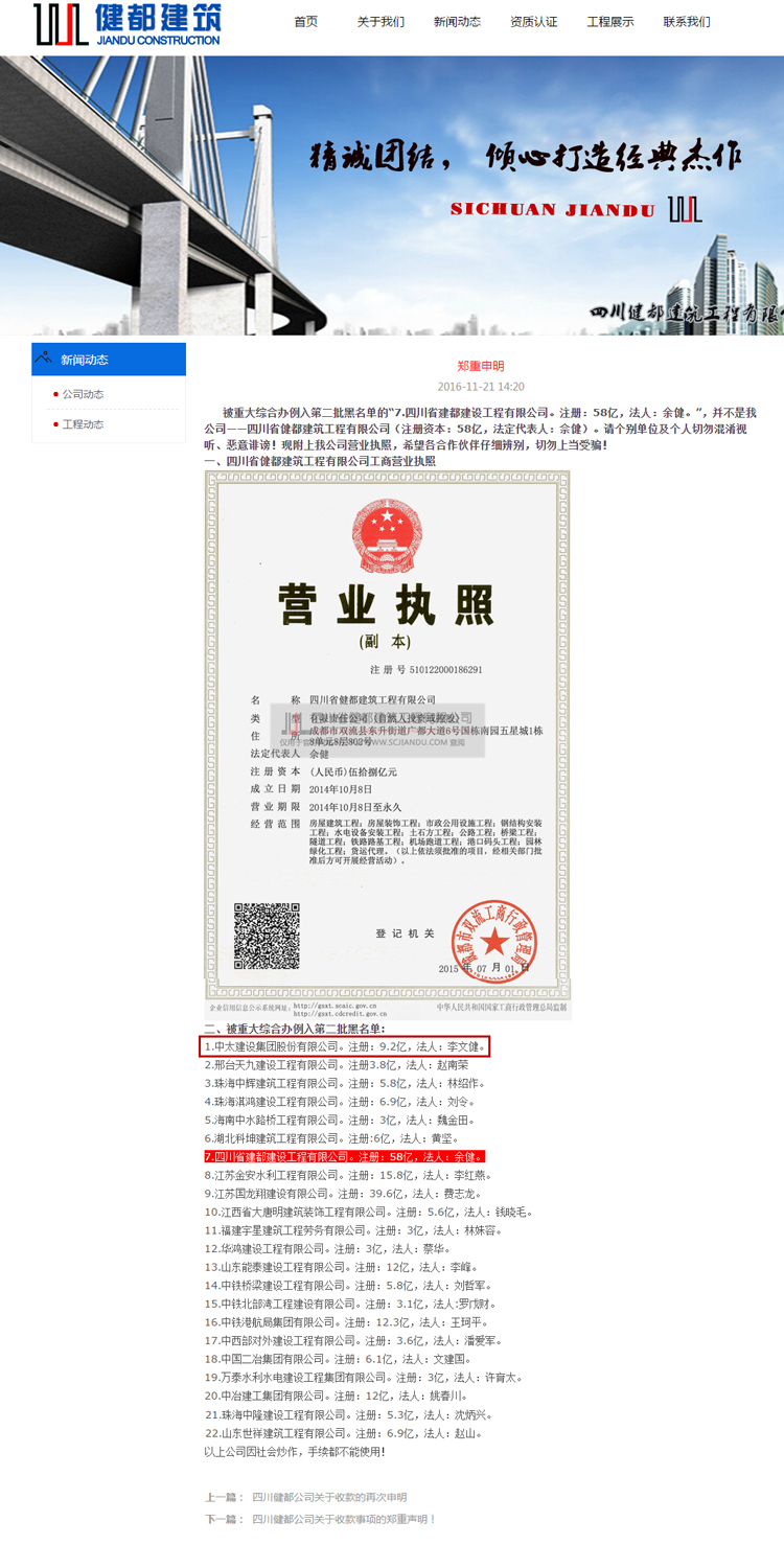 附:四川省健都建筑工程有限公司網(wǎng)站聲明截圖。