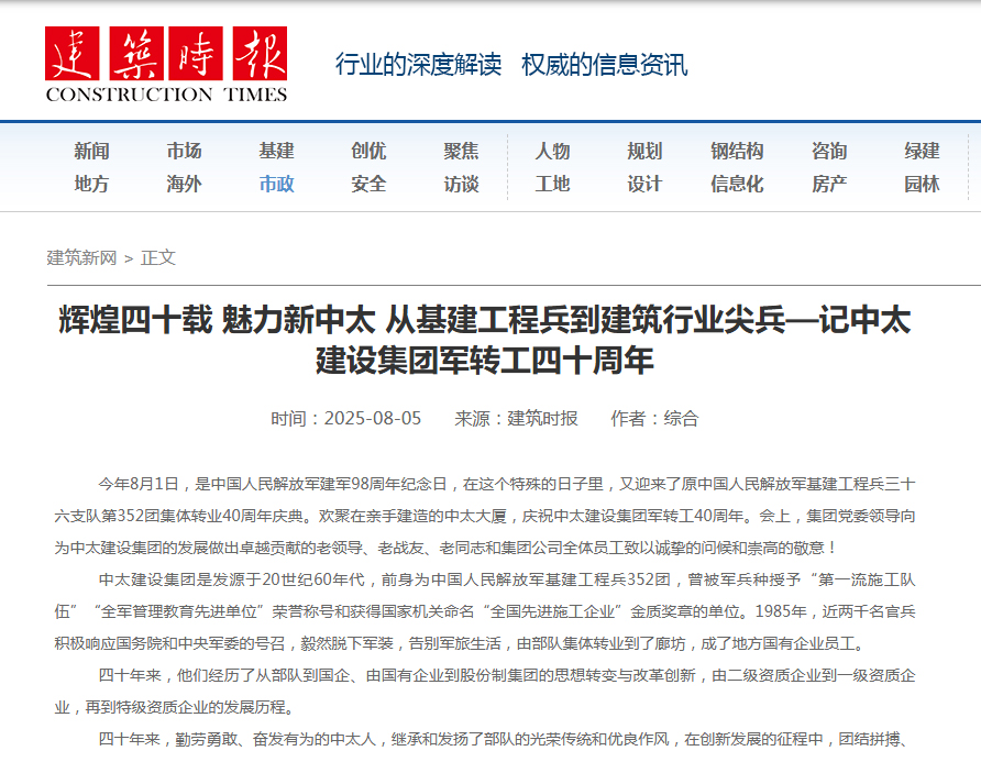 建筑時報8月5日報道了輝煌四十載 魅力新中太 從基建工程兵到建筑行業(yè)尖兵——記中太建設(shè)集團(tuán)軍轉(zhuǎn)工四十周年
