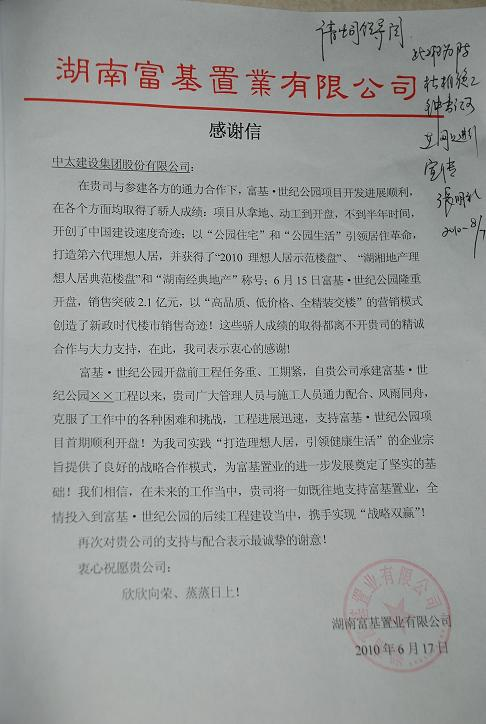感謝信中說,6月15日,富基.世紀公園隆重開盤,銷售突破2.1億元,這些驕人成績都離不開中太集團的精誠合作與大力支持。同時他們表示,雙方將在項目的后續(xù)工程建設中,相互支持,攜手實現(xiàn)“戰(zhàn)略雙贏”。 |