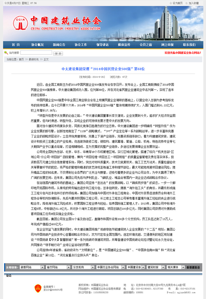 中國建筑業協會報道了中太建設集團榮膺“2014中國民營企業500強”第68位