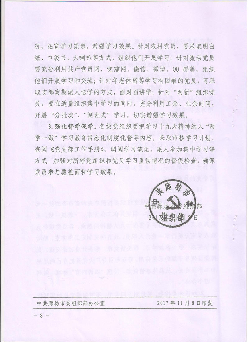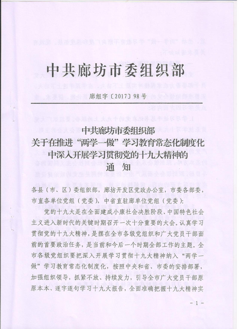 [2017]24號關于轉發《中共廊坊市委組織部<關于在推進“兩學一做”學習教育常態化制度化中深入開展學習貫徹黨的十九大精神的通知>》的通知