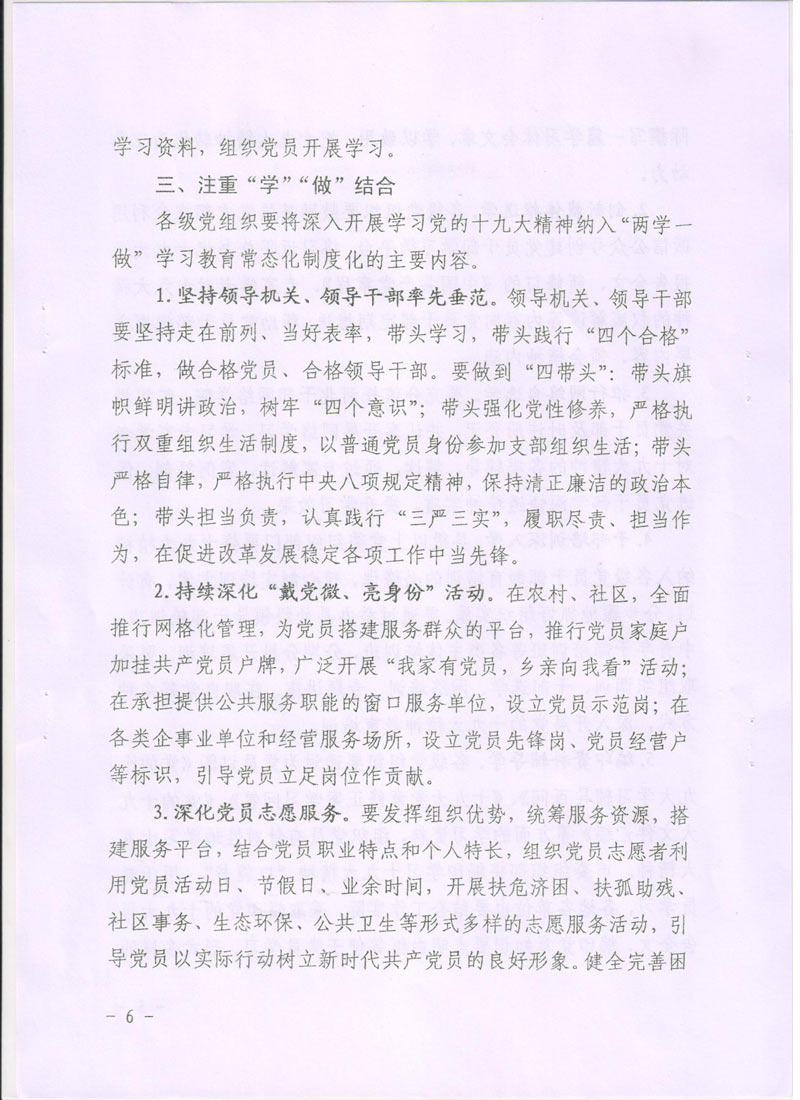 現將中共廊坊市委組織部《關于在推進“兩學一做”學習教育常態化制度化中深入開展學習貫徹黨的十九大精神的通知》轉發給你們。請認真按照通知要求,緊密聯系本單位實際,把深入開展學習貫徹十九大精神納入“兩學一做”學習教育常態化制度化,把十九大精神學深學透,全面把握十九大精神實質。